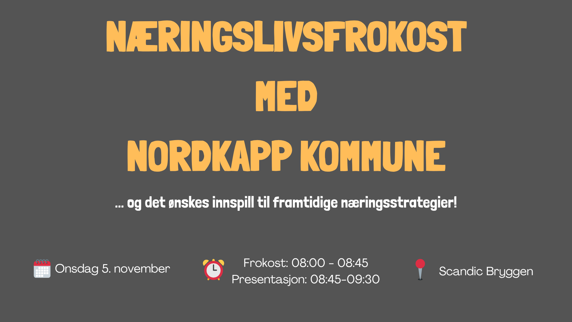 Nordkapp kommune inviterer næringslivet til frokostmøte med presentasjon av ferske funn fra næringslivsundersøkelsen. Takk til alle som har svart – dere gir oss viktig innsikt!
